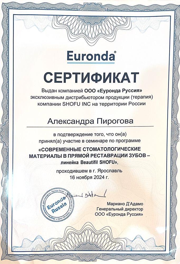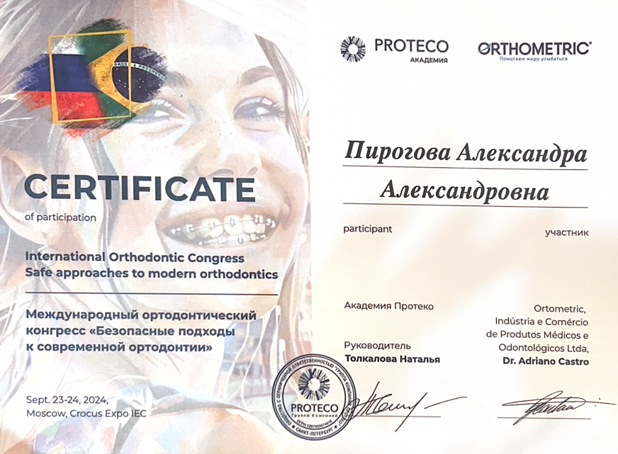 Выпускница Приволжского исследовательского медицинского университета (ПИМУ) 2025 года по специальности «Стоматология». Прошла дополнительное обучение по направлению «Ортодонтия», что подтверждает её профильную экспертизу в создании красивых и ровных зубных рядов.